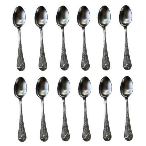 Offered is a Set of Twelve Teaspoons in the Deer pattern by Cambridge Silversmiths.